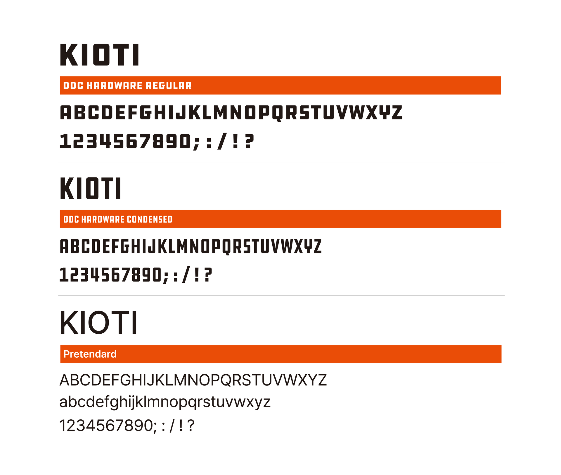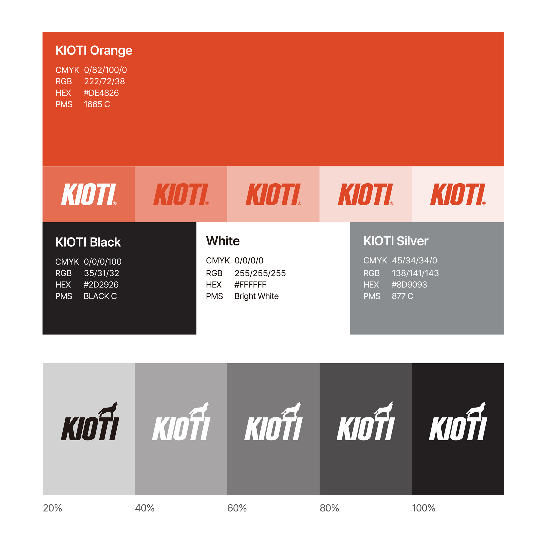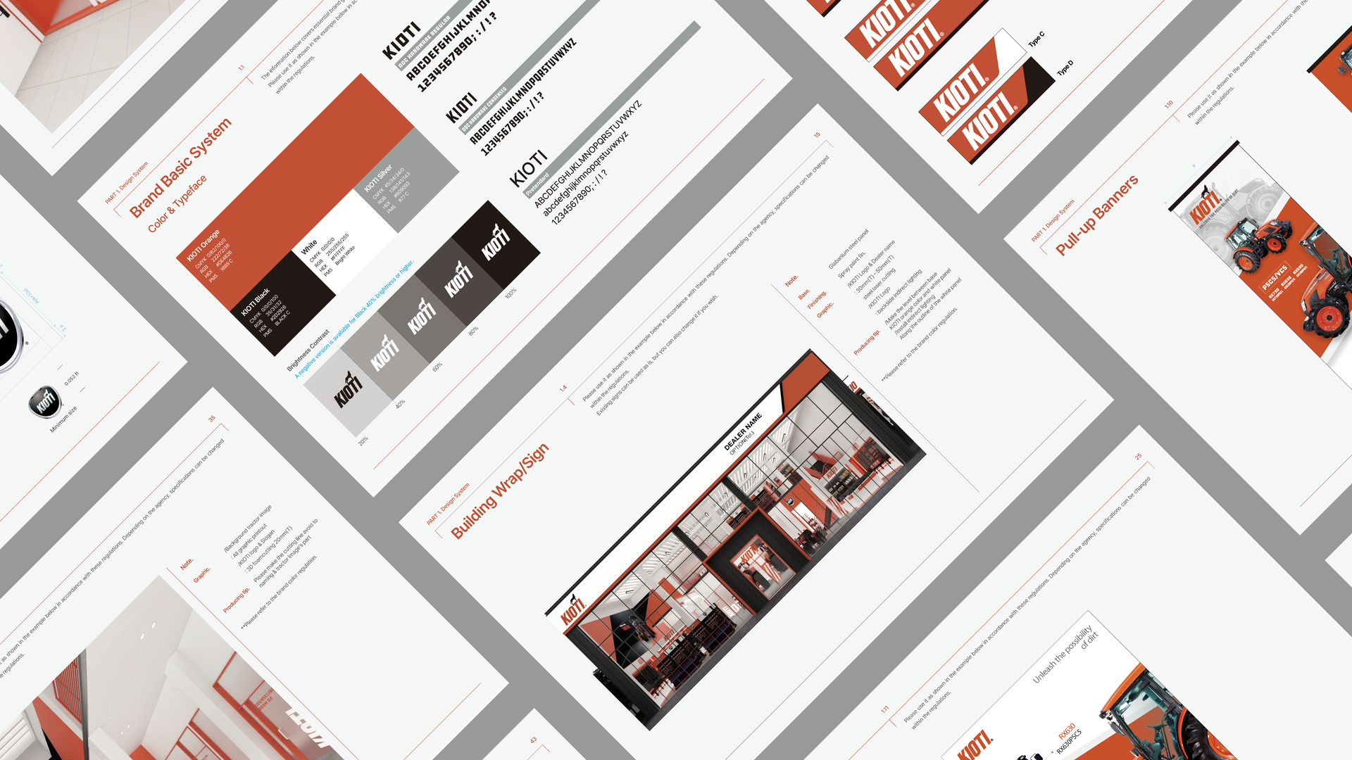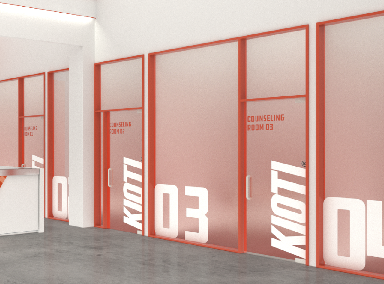 KIOTI의 주 색상은 강렬하고 에너지 넘치는 KIOTI Orange로, 브랜드가 지닌 도전 정신과 활력을 선명하게 드러냅니다. 여기에 Black, White, Silver를 보조적으로 활용해 컬러 시스템의 안정감을 더하며, 다양한 환경과 매장에서 브랜드 경험을 보다 선명하고 매력적으로 전달합니다.